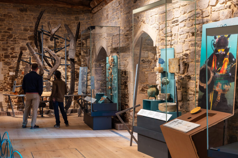 The largest of the permanent exhibition galleries, ‘Shipwreck!’, showcases Poole’s extraordinary maritime archaeology collections, including dramatic open displays of the carved timber elements of a grand mediaeval ship; a rare, preserved 10-metre-long Iron Age log boat centre-stage and a sculptural display of mediaeval ships’ timbers, all on open display within the meticulously restored, dramatic Grade I listed mediaeval Wool Hall.